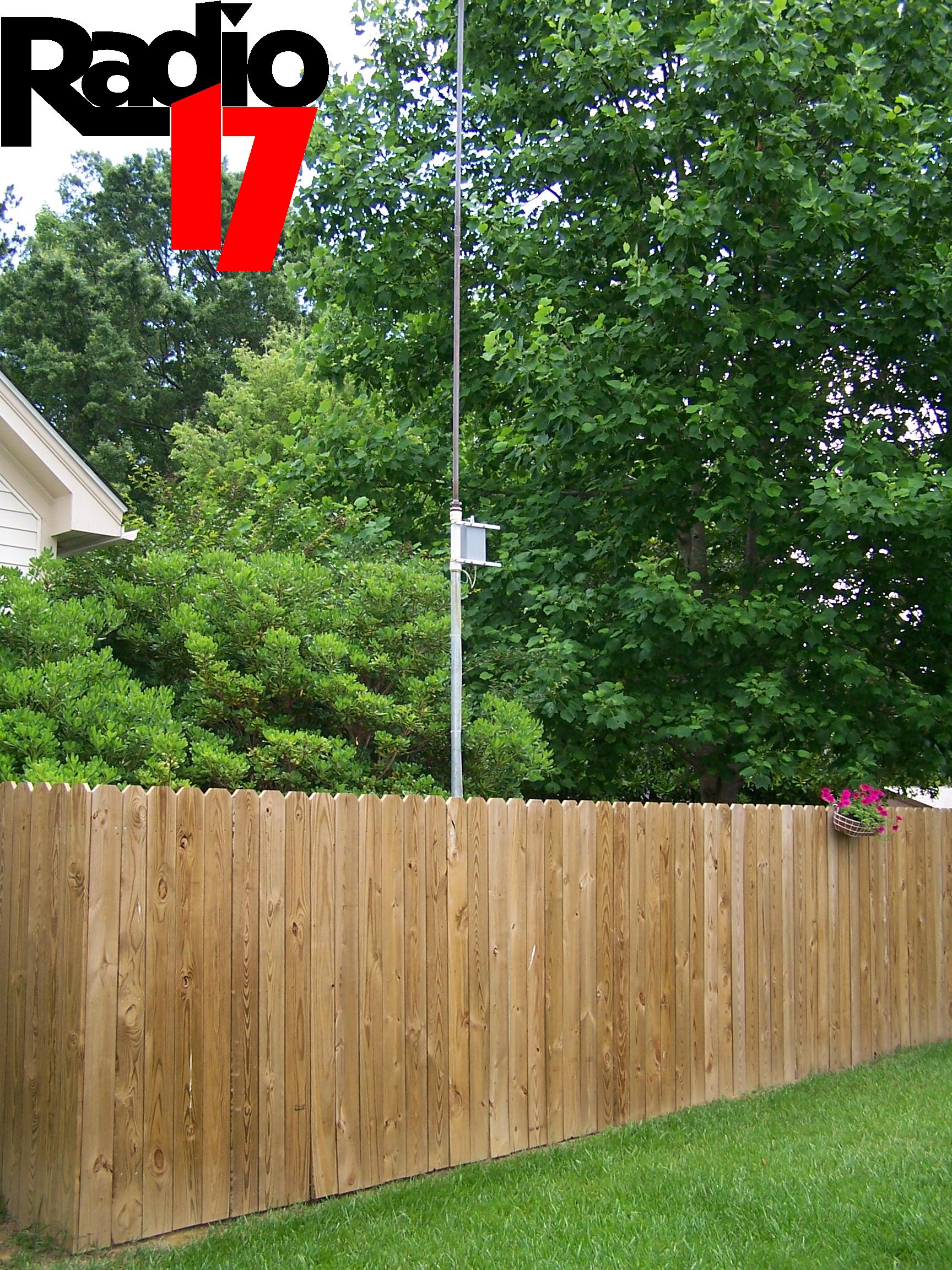 Photo – The wooden picket fence that supports the mounting pole, transmitter, and mast. Be sure you get your neighbor’s permission to do this!